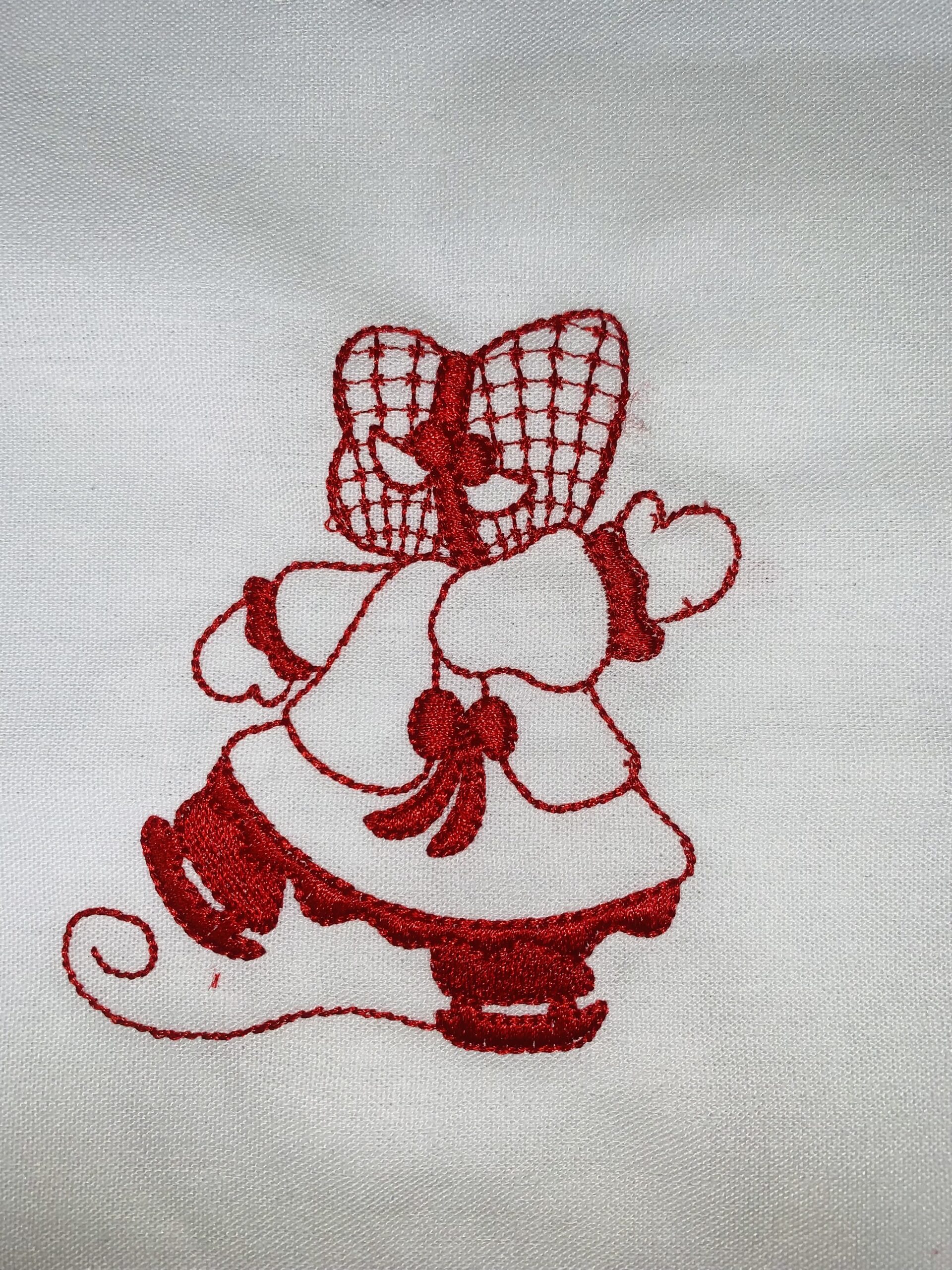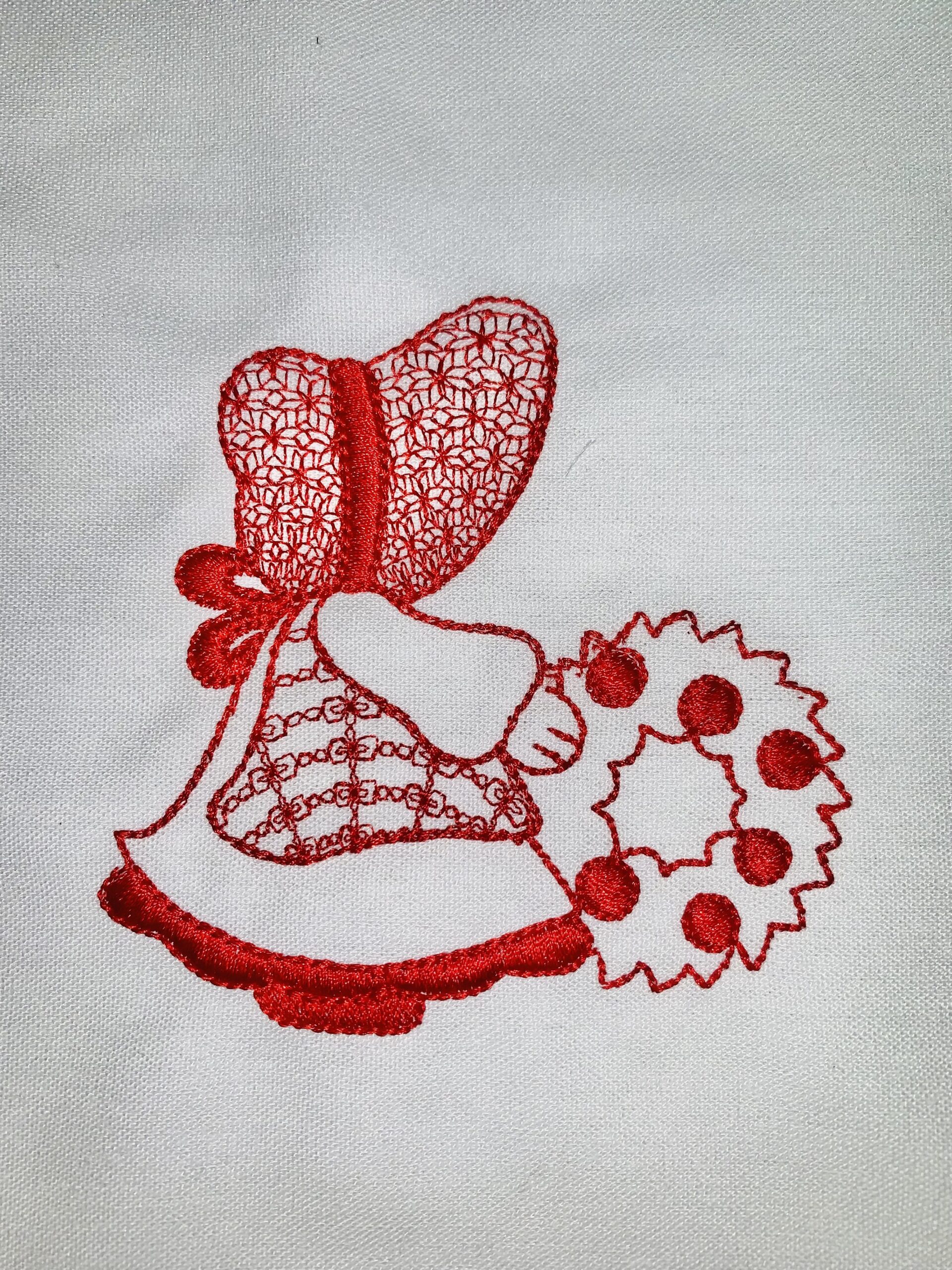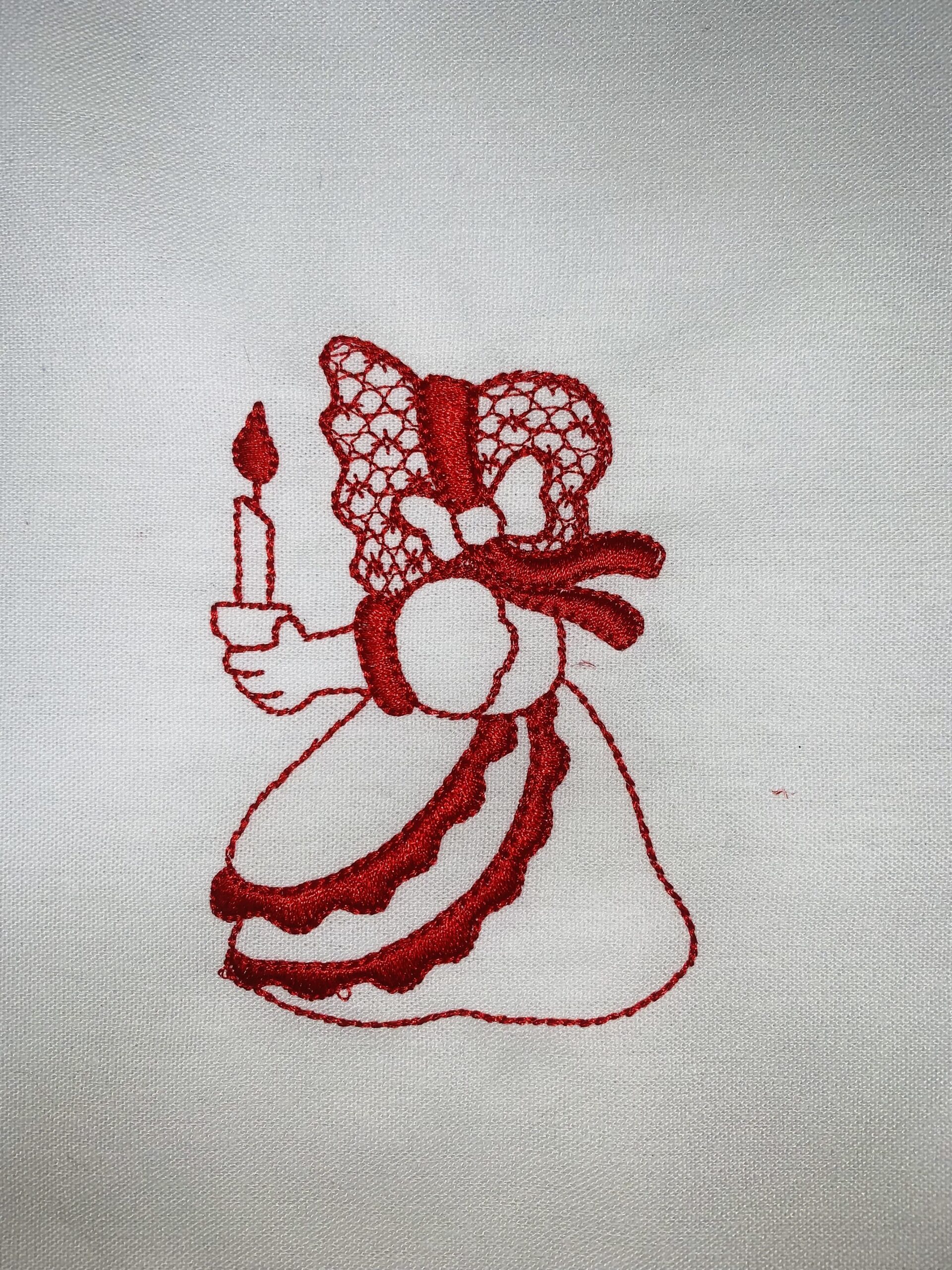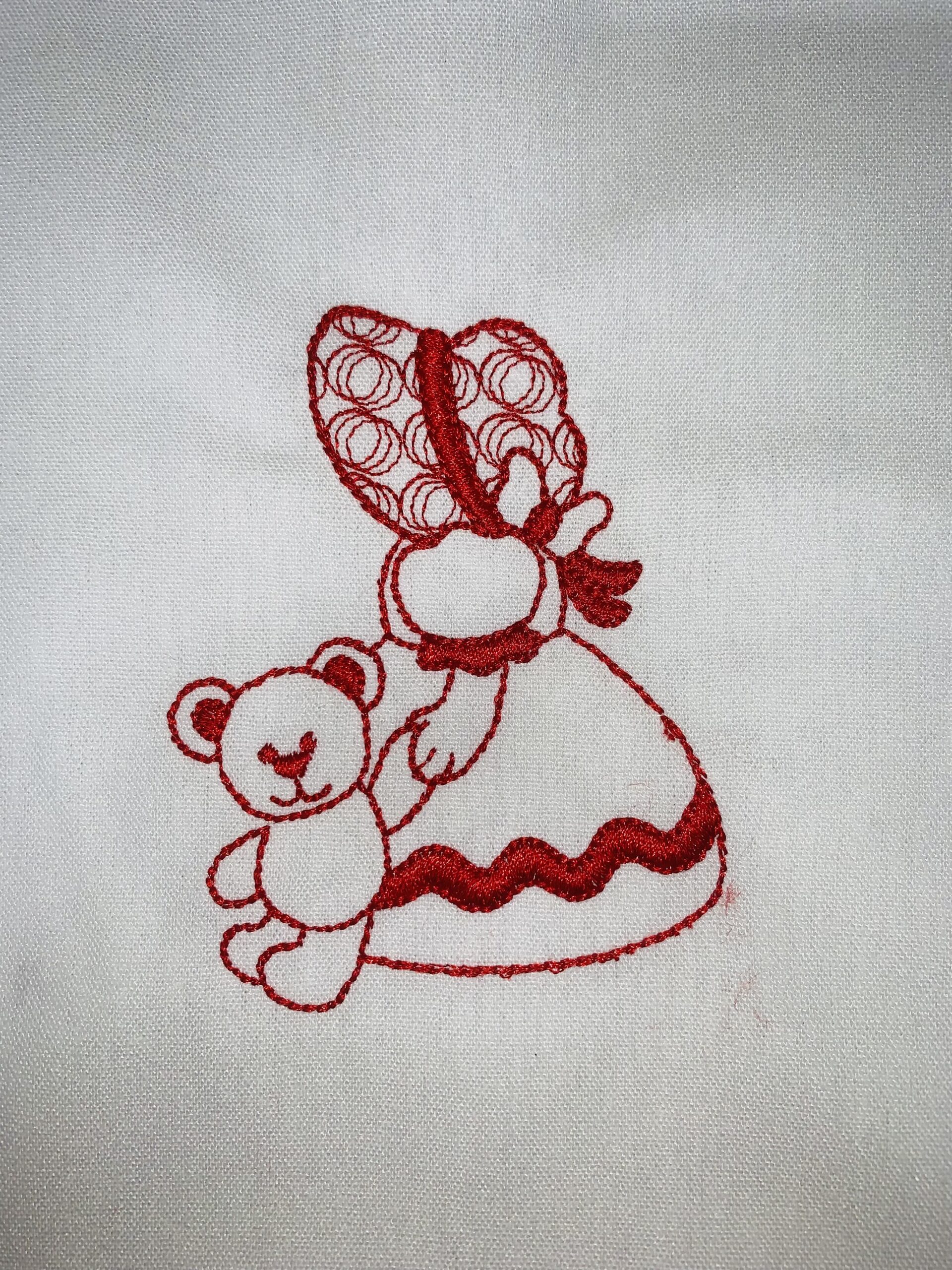 Each block is 10″ x 10″ with the Sunbonnet Sue design approximately 4.5″. Machine embroidered with a red Glide thread on a white linen fabric.