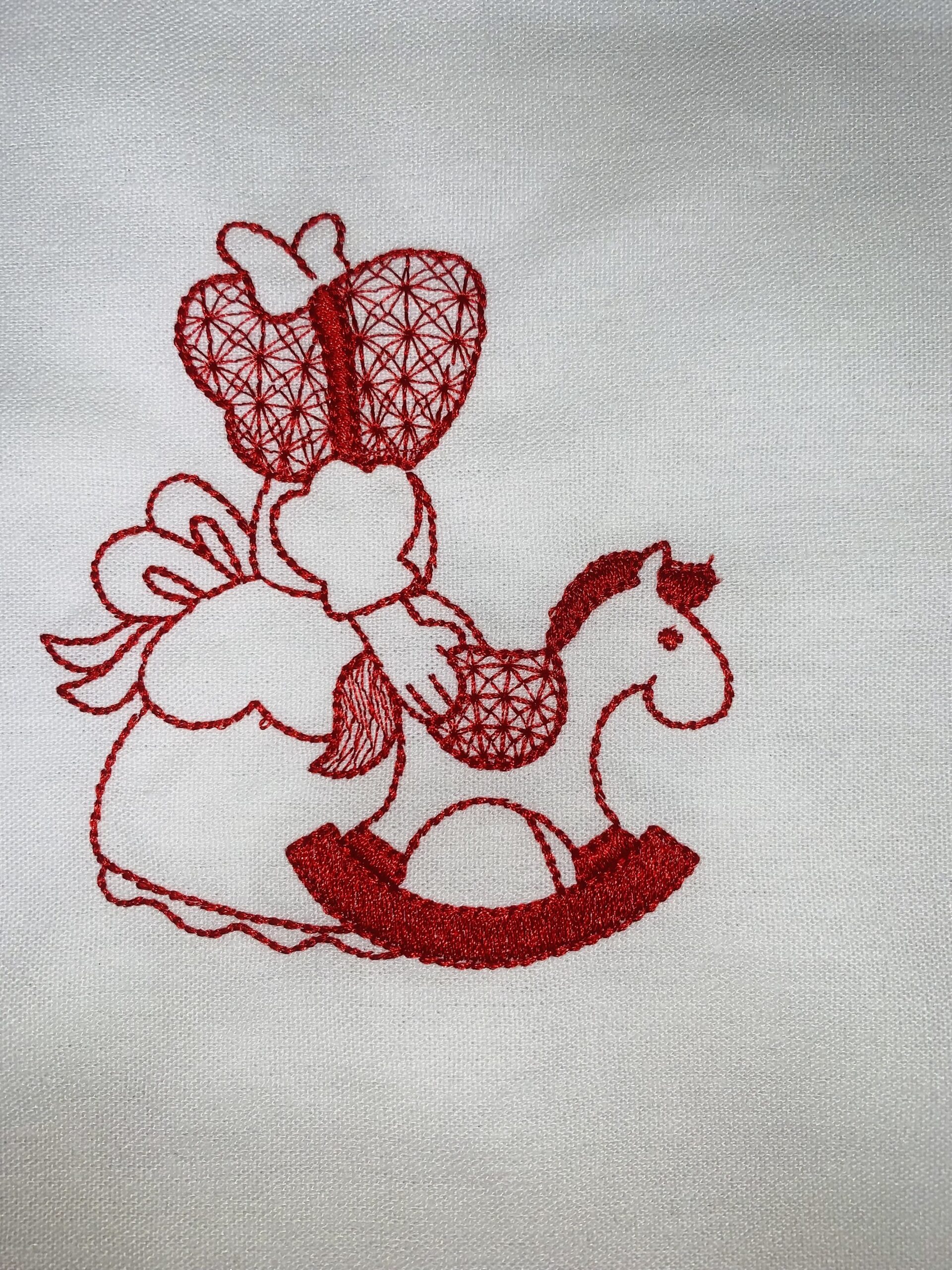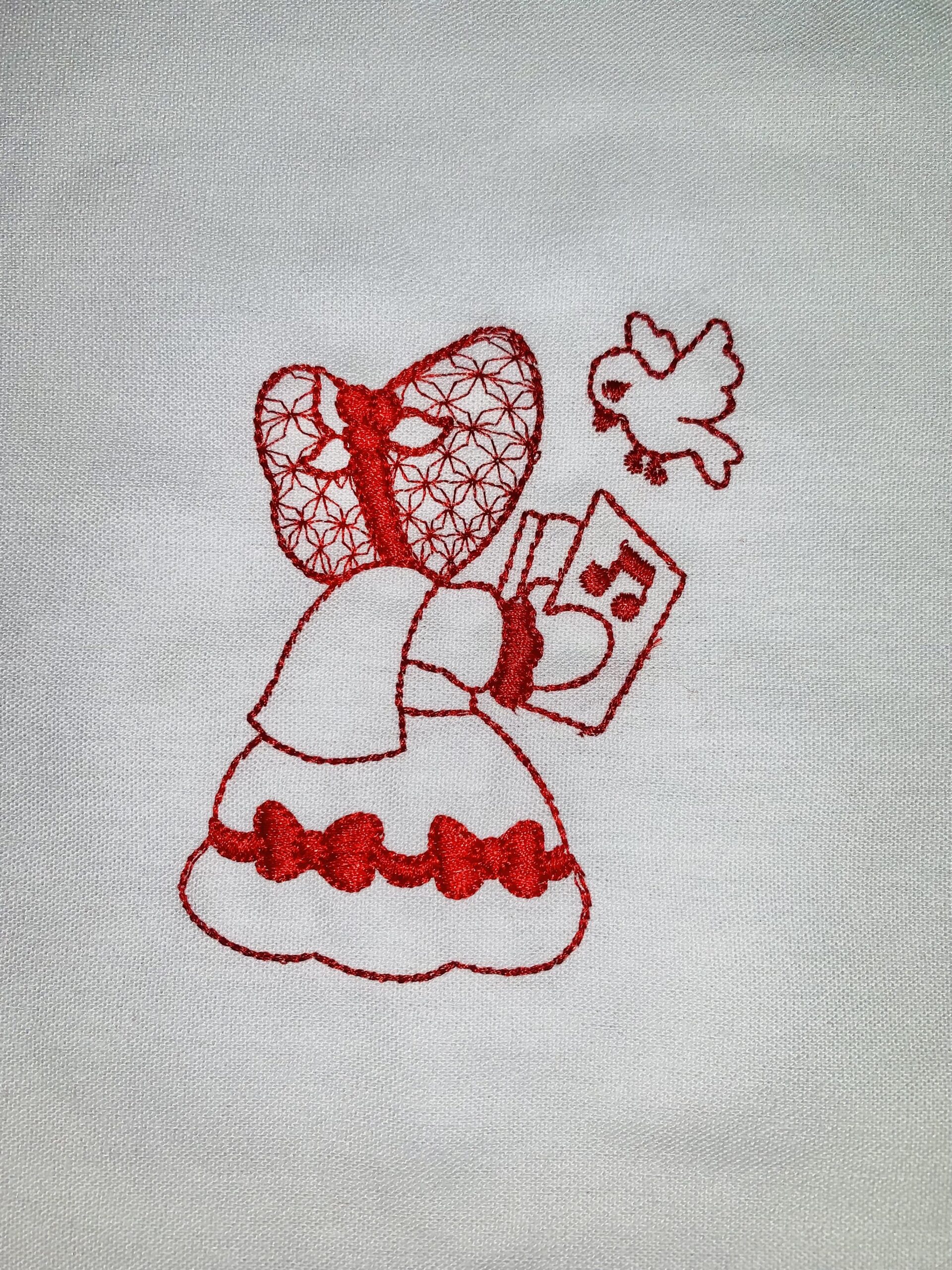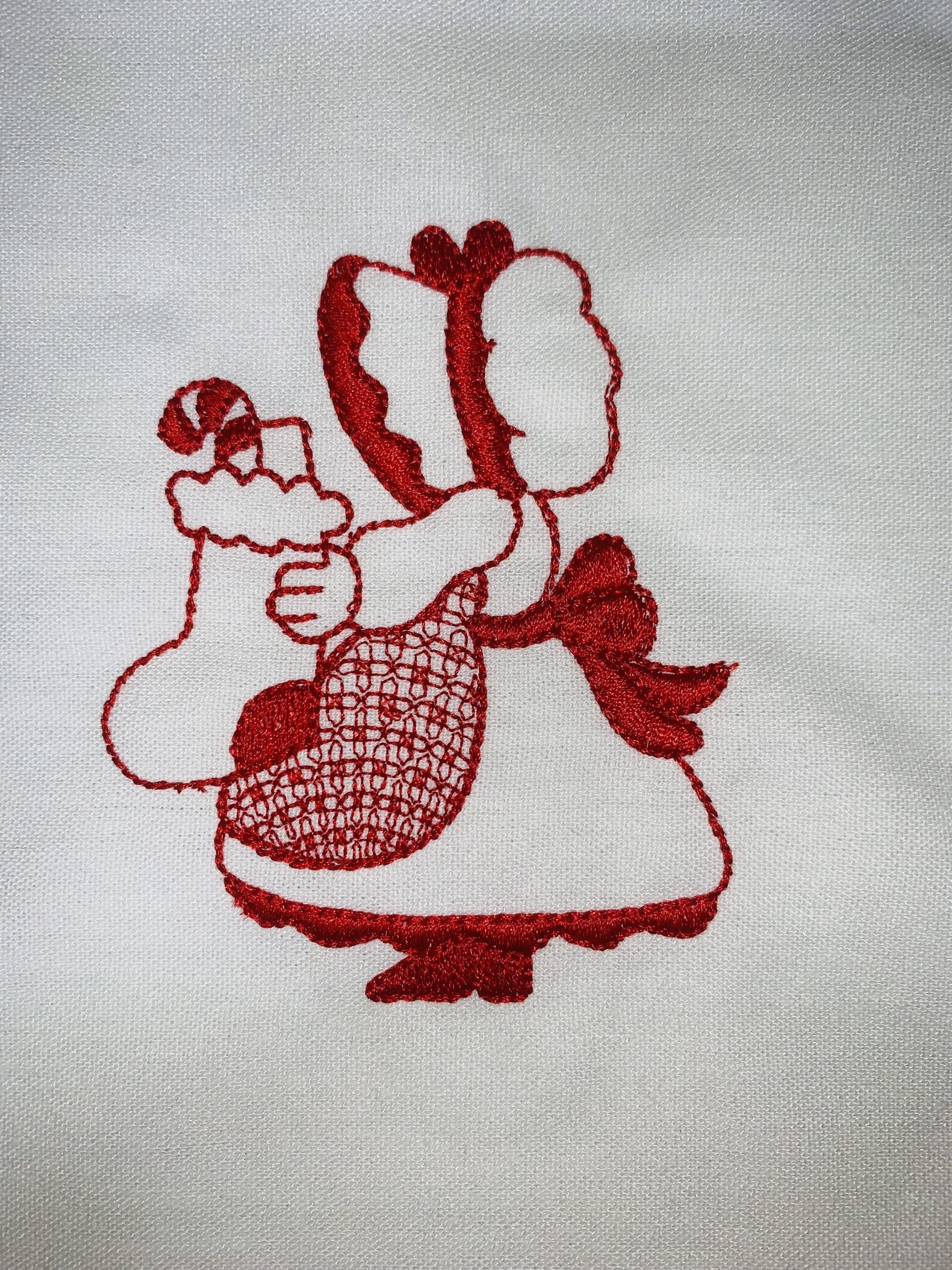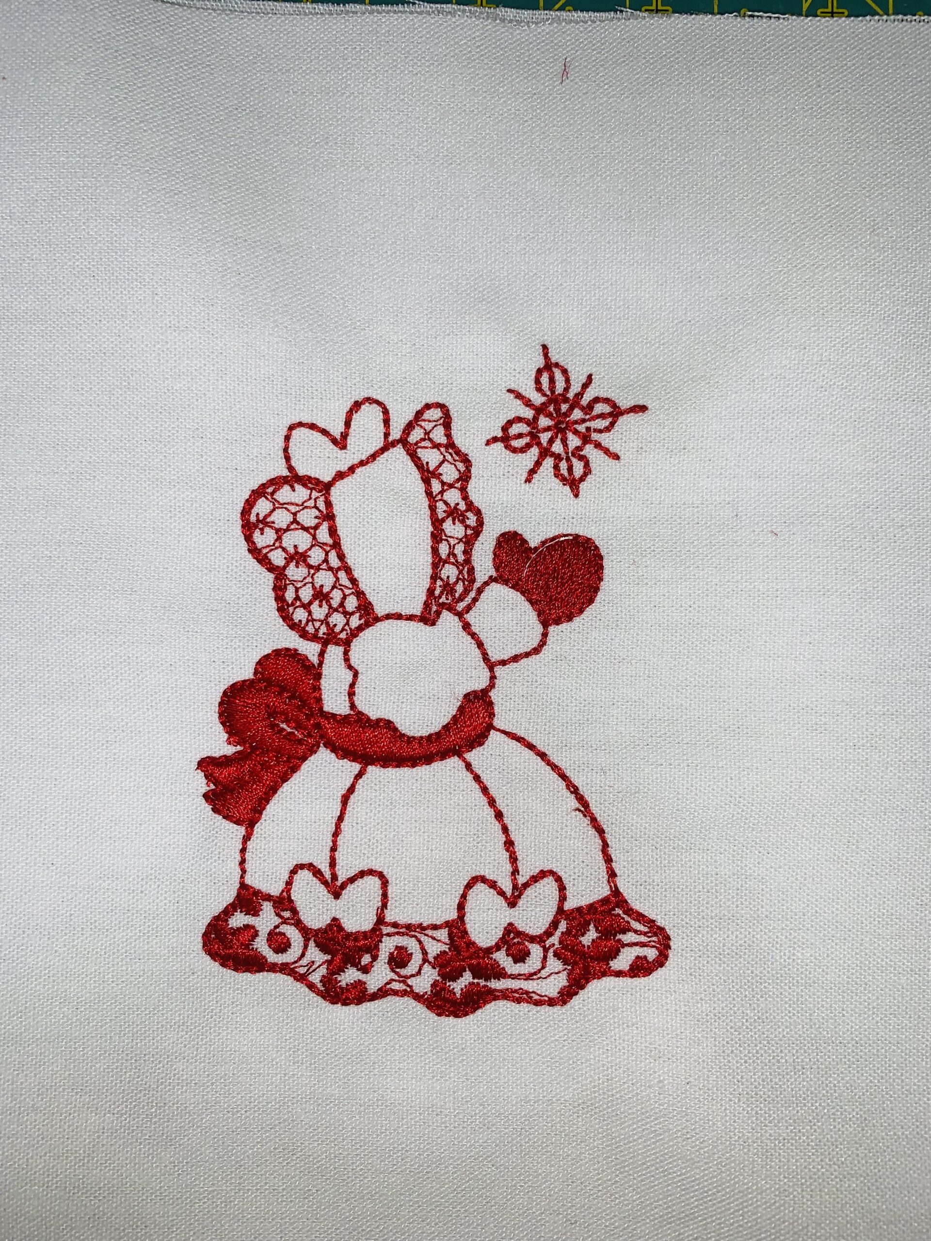 Each block is 10″ x 10″ with the Sunbonnet Sue design approximately 4.5″. Machine embroidered with a red Glide thread on a white linen fabric.