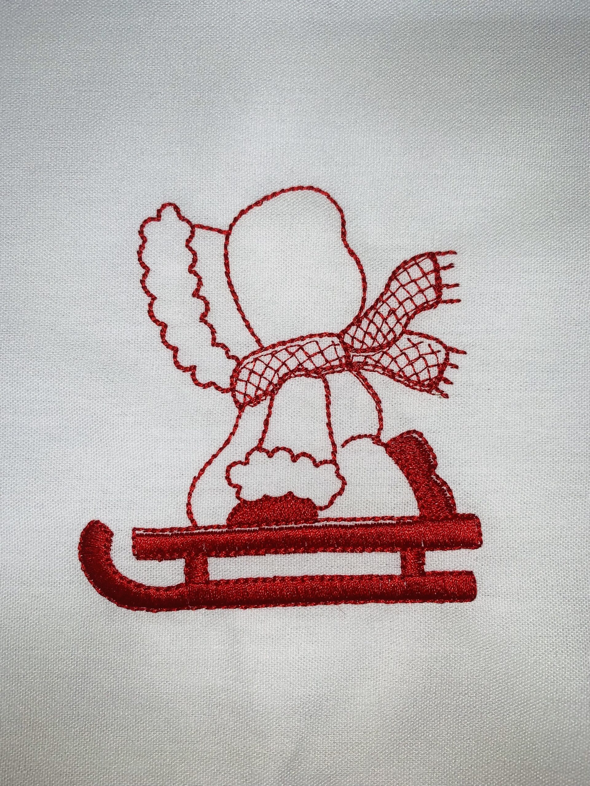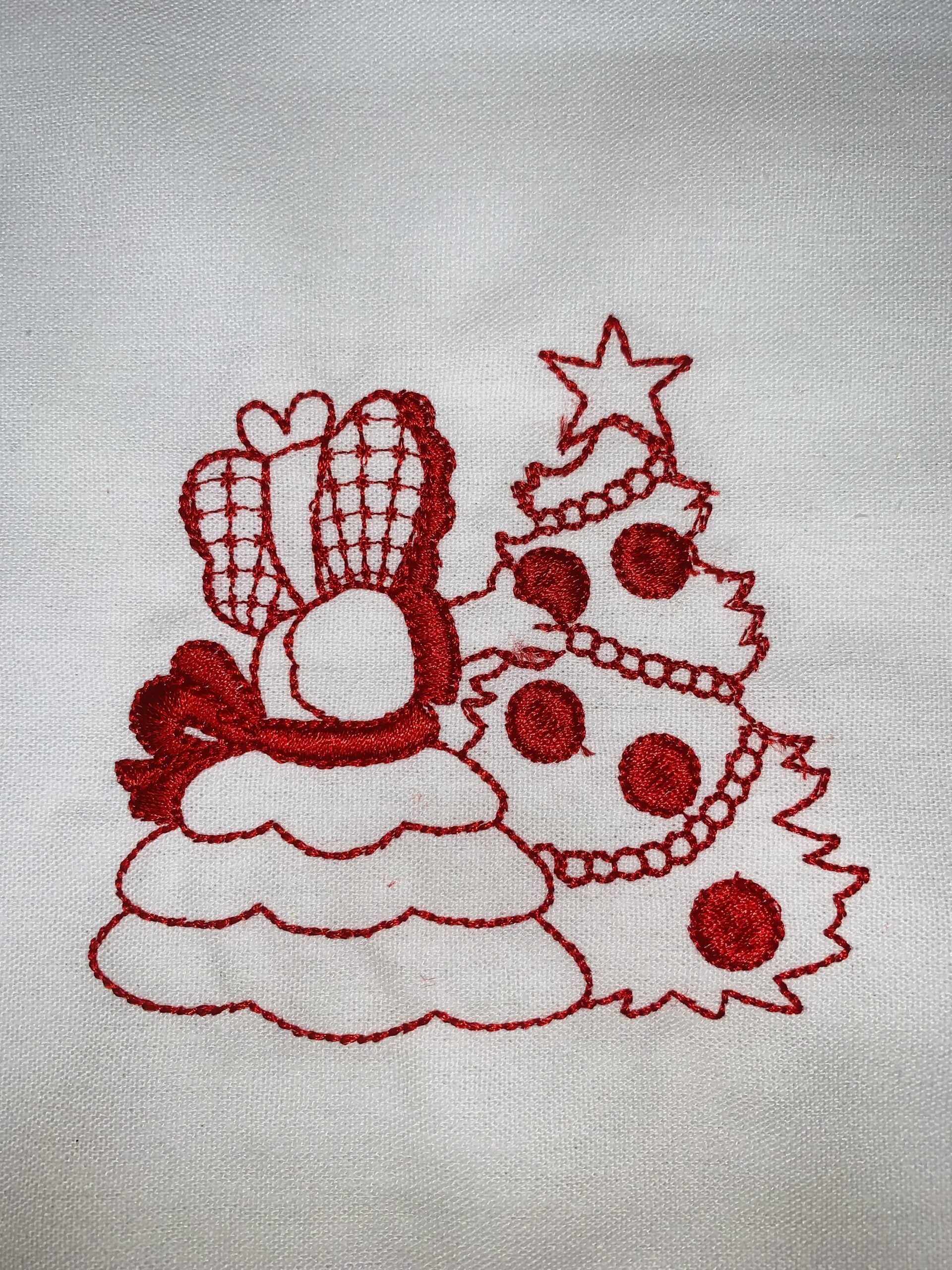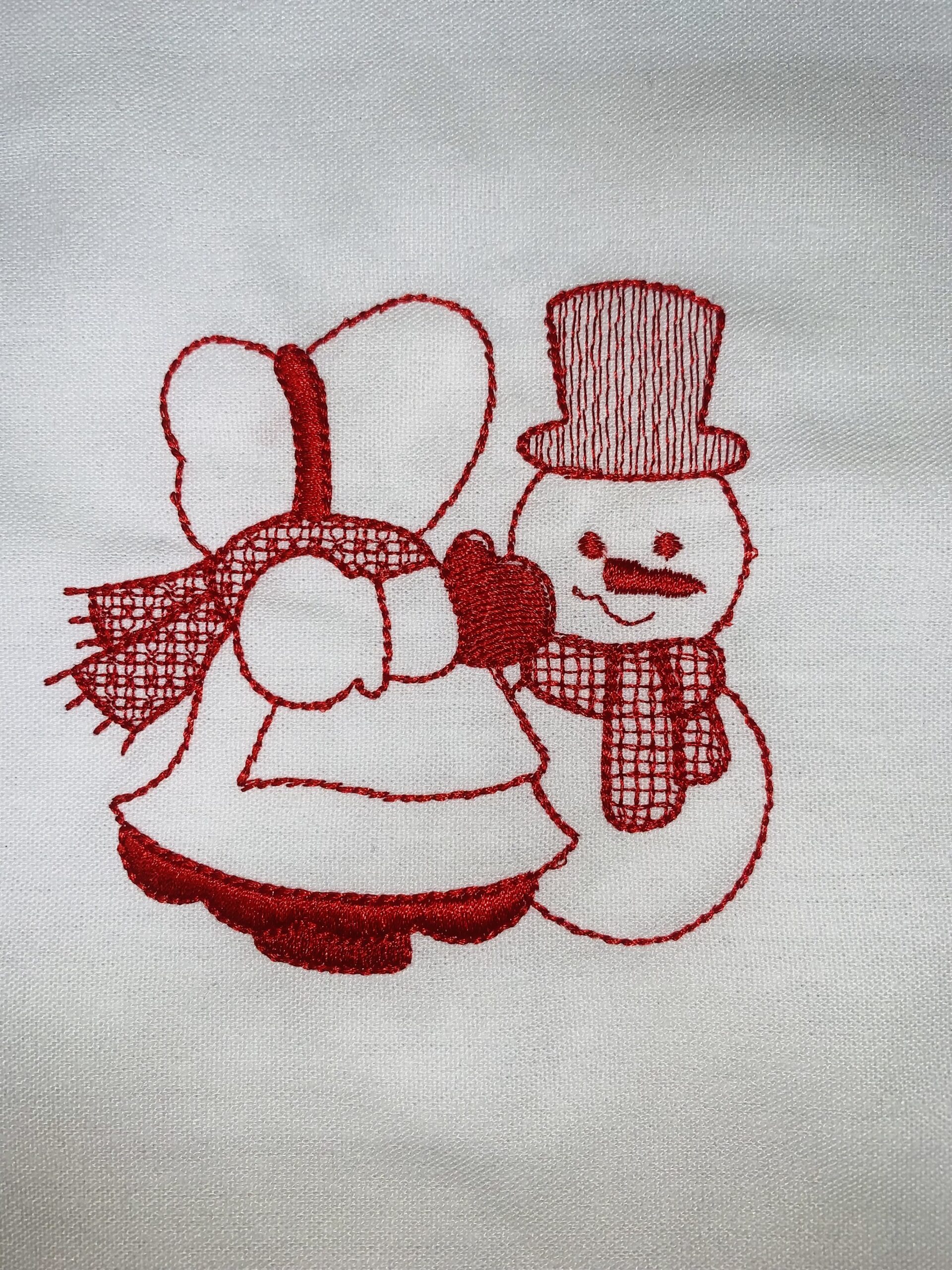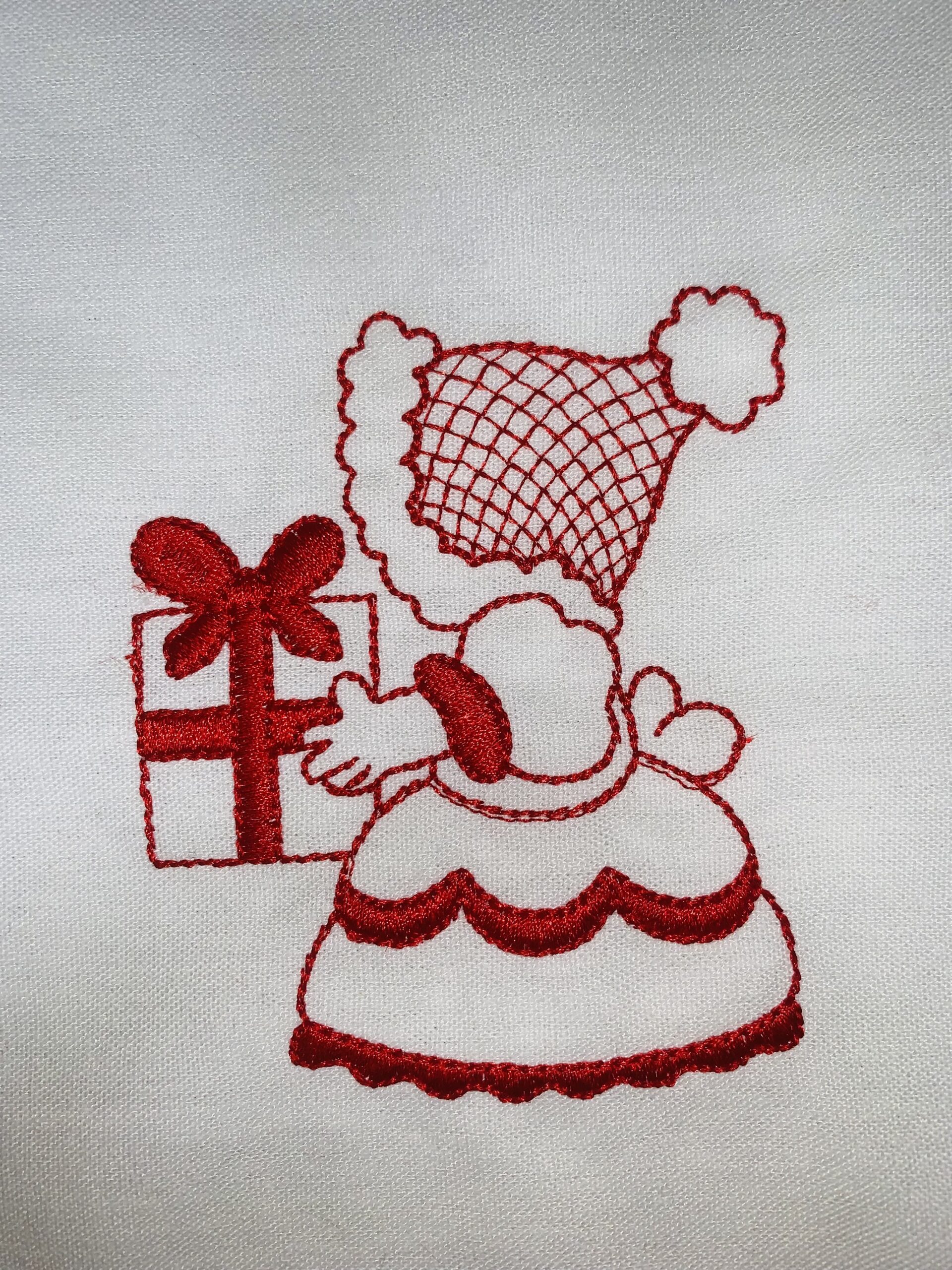 Each block is 10″ x 10″ with the Sunbonnet Sue design approximately 4.5″. Machine embroidered with a red Glide thread on a white linen fabric.